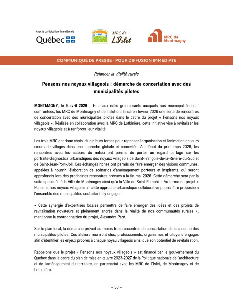 Communiqué – Projet « Pensons nos noyaux villageois »